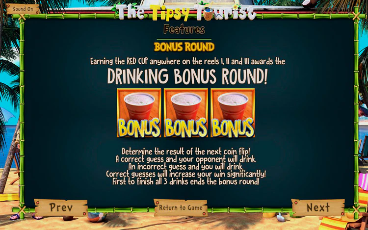 - Бонусный раунд за выпивку активируется при выпадении красного кубка. В игре нужно угадать результат подбрасывания монеты. При угадывании опустошается чашка, что приносит денежный приз.