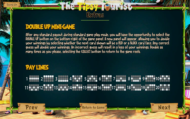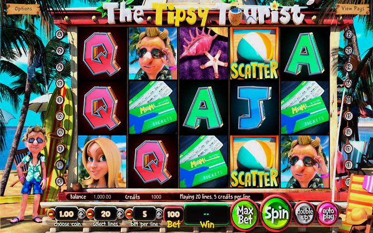 Слот с изображениями отдыхающих, напитков, ракушек, пляжа повещен праздникам на Майами-бич. Вступительное видео знакомит игрока со скучающим мужчиной в костюме и галстуке, работающим в офисе, который решает провести отпуск в Майами. Затем переносит на игровой экран, где сбоку от барабанов стоит мужчина в шортах и солнцезащитных очках. Играть в игровой автомат The Tipsy Tourist в деморежиме можно в любом казино, но игроки лишат себя возможности получить ценные призы благодаря бонусным функциям.