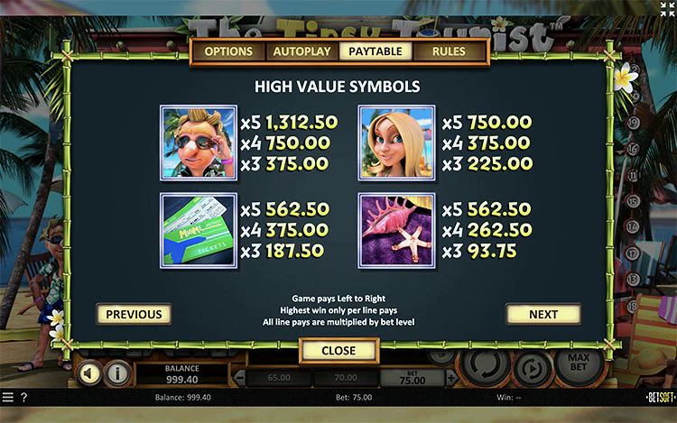 Что примечательно в Tipsy Tourist, так это то, что им могут наслаждаться без каких-либо хлопот даже начинающие игроки, поскольку он не только прост в использовании, но и доступен по цене. Три элемента управления ставками слева позволяют выбирать, на какие линии выплат произвести оплату, регулировать номинал монет и даже увеличивать количество монет на линию выплат. Игроки могут сначала попробовать онлайн слот The Tipsy Tourist бесплатно. Игра доступна на всех устройства, включая телефоны.