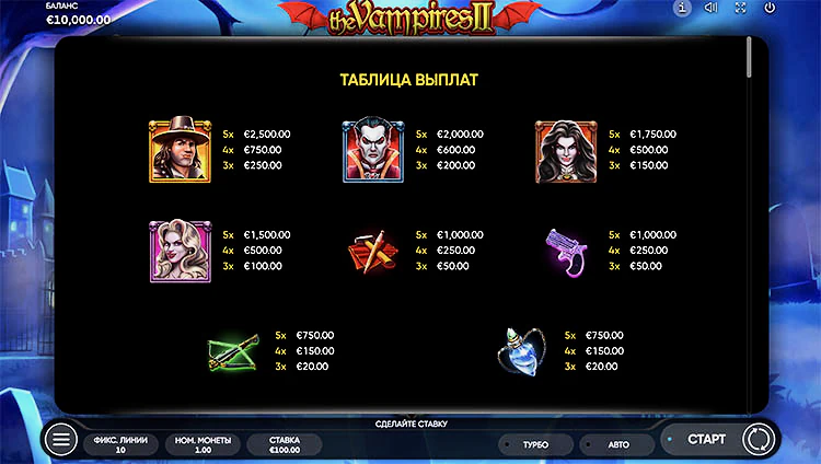 The Vampires 2 представляет собой пятибарабанный игровой автомат с 10 линиями выплат. Игроки могут наслаждаться разнообразными функциями, включая бонусные символы, бесплатные вращения и риск-игру. Среди символов встречаются вампиры, кровавые ножницы, свечи и кубки с кровью, каждый из которых дарит свои неповторимые выигрыши.