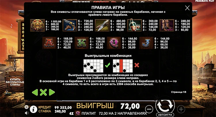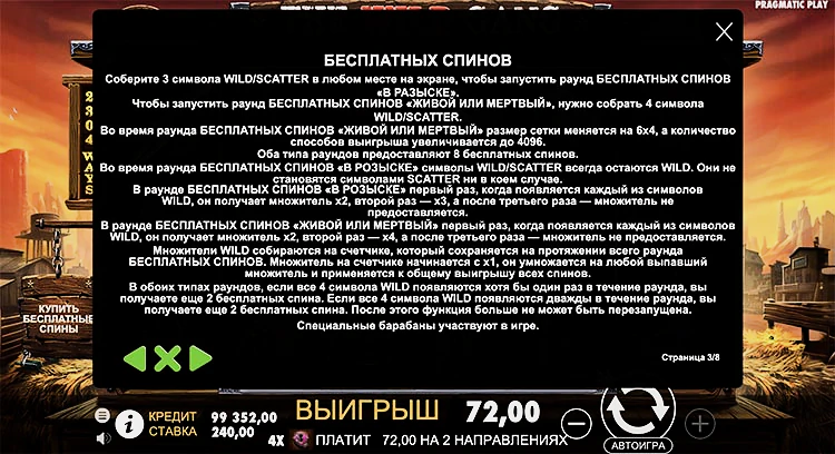- 4 джокера активируют раунд бесплатных вращений Dead or Alive, расширяя сетку игры до 6 × 4 и предоставляя игрокам 4096 способов выиграть, а также множитель x4 на джокерах.