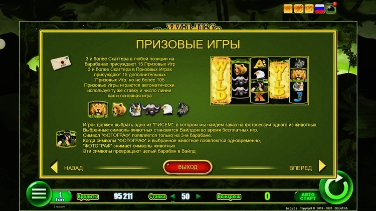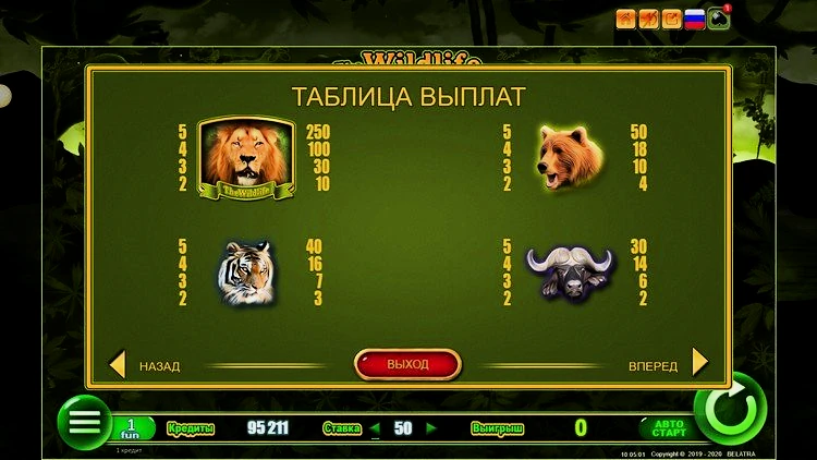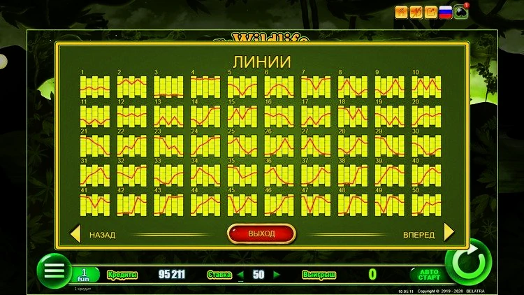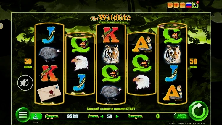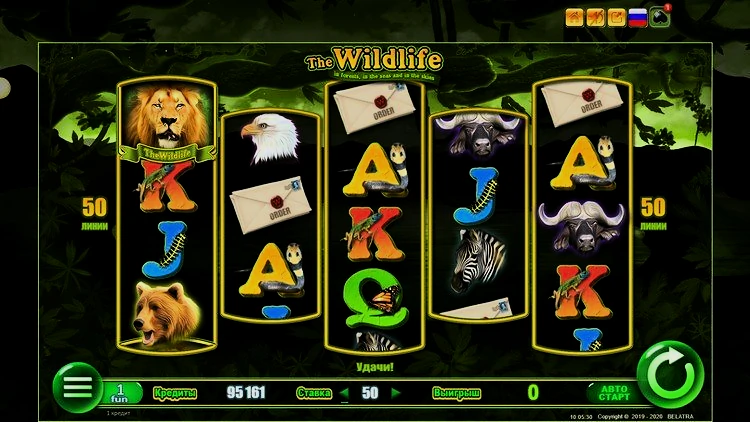 Wildlife имеет уникальную игровую сетку с пятью барабанами и пятидесятью линиями выплат. Раскладка отличается от обычной: на первом, центральном и последнем барабанах по четыре символа, а на втором и четвертом — по три. Выигрышные комбинации выстраиваются исключительно слева направо.