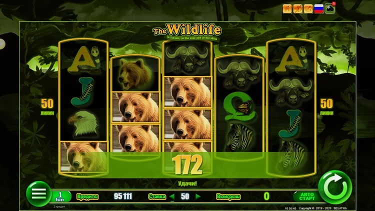 Игровой аппарат The Wildlife 2019 года от провайдера Белатра сделан в привычной для студии тематике дикой природы и животного мира. Сюжет разворачивается неподалеку от безмятежного озера, расположенного в джунглях у подножия горы, а игровой процесс сопровождается необычной этнической музыкой. На барабанах изображены зебры, львы, медведи, змеи и экзотические птицы. Максимальный множитель слота составляет 5.000х а отдача игроку – 96.15%.