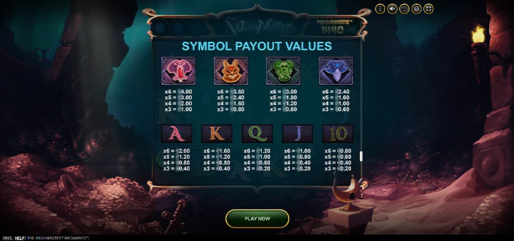 В Wish Master Megaways, как следует из названия, реализован механизм Megaways, с возможностью выиграть до 117 649 способов. Каждый раз, когда вы вращаете барабаны, количество рядов на барабане будет меняться, а значит, меняется и количество линий выплат. Помимо увлекательной тематики и особенностей игрового процесса, игровой автомат Wish Master Megaways знакомит новых игроков с новаторской лавинной механикой NetEnt. Лимиты ставок для Wish Master Megaways составляют от 0,10 до 40 фунтов стерлингов за спин.