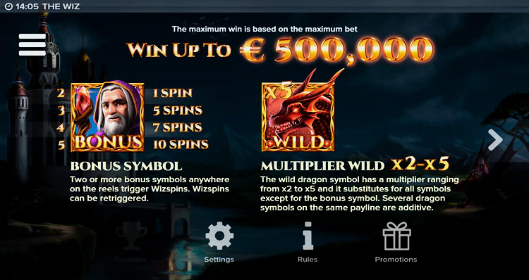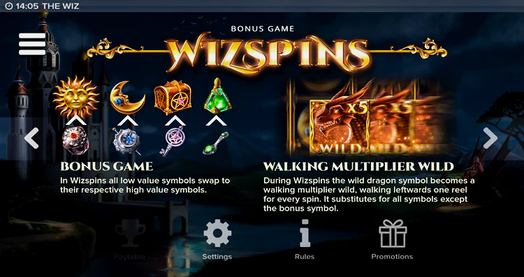 В The Wiz есть дикий символ дракона, который заменяет все остальные символы и помогает формировать выигрышные комбинации. При появлении волшебного существа, к выигрышу применяется случайный множитель до 5x, что обеспечивает еще более высокие выплаты и захватывающий игровой процесс.