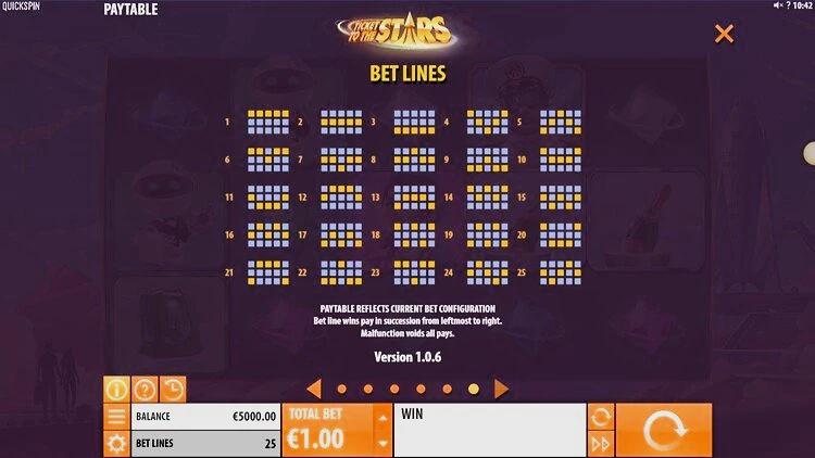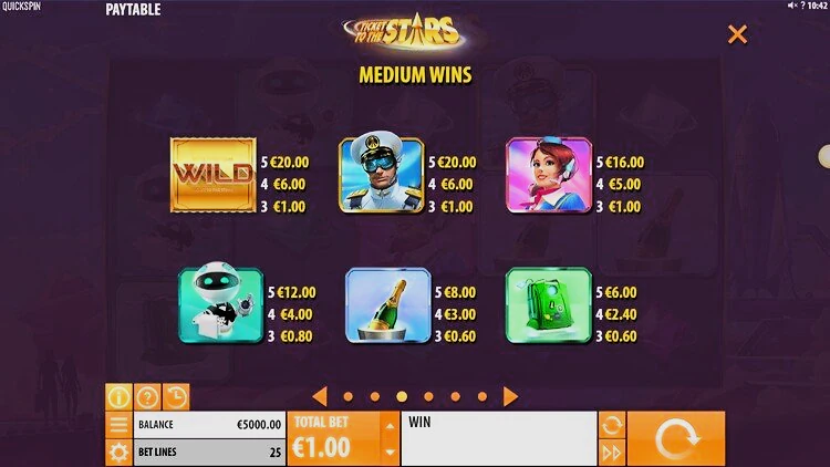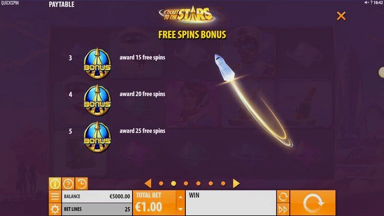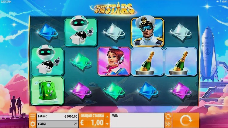 Игровой автомат Ticket to the Stars погрузит игроков в атмосферу межгалактических приключений, а соответствующее музыкальное сопровождение дополняет игровой процесс. Уровень отдачи высокий — 96,52%, это характерная черта слотов от QUICKSPIN. Еще один плюс — это качественная, современная графика.