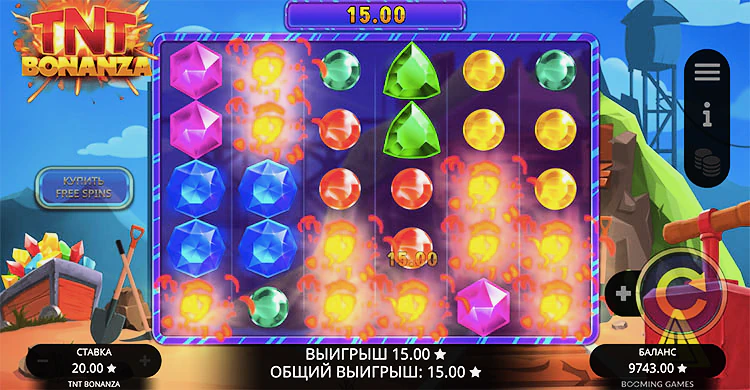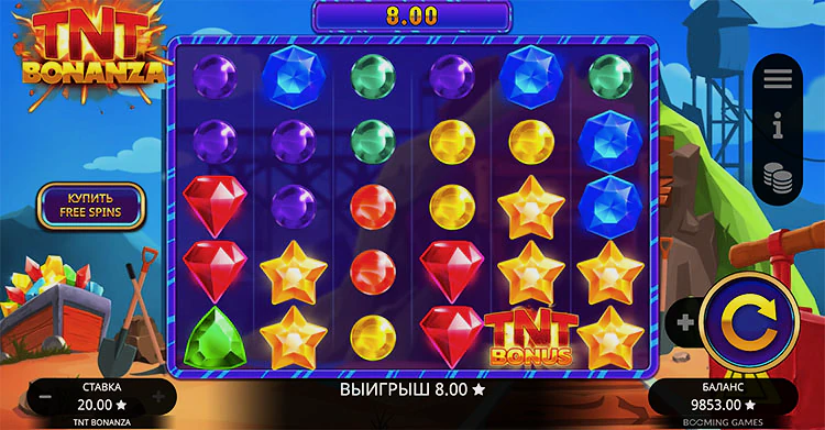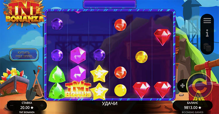 TNT Bonanza приглашает игроков отправиться в захватывающее приключение в недра земли, шахту, где драгоценные камни сулят необычайные призы. Созданный известным разработчиком программного обеспечения Booming Games, этот слот на шахтерскую тематику предлагает увлекательный игровой процесс, обогащенный множеством заманчивых бонусных функций. Среди них — бесплатные вращения, множители и каскадный принцип выплат.