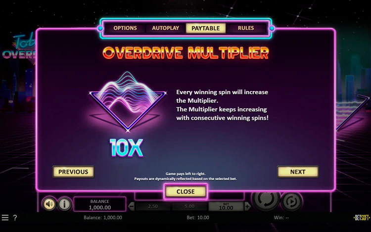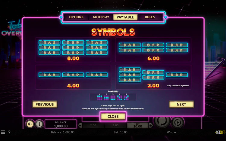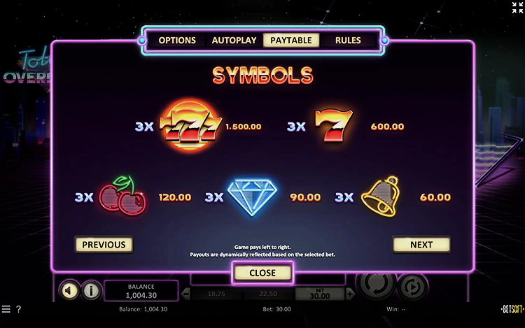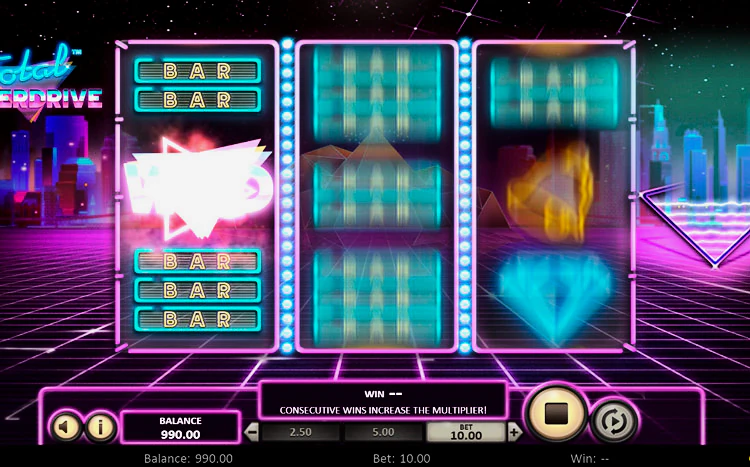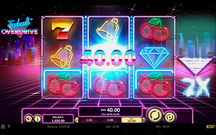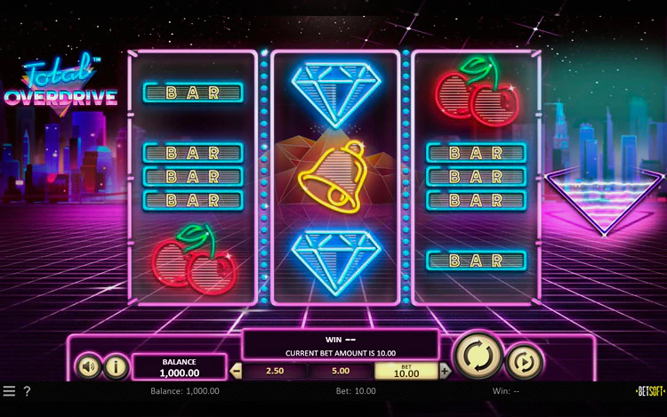 В онлайн-слоте Total Overdrive сетка 3×3 из неоновых символов. Разработка вдохновлена фильмом Tron. Сетка фиолетовых линий, наполненных вспышками энергии, простирается до небоскребов большого города вдали. Даже название игры с неоновым и хромированным эффектом выдержано в стиле 80-х.