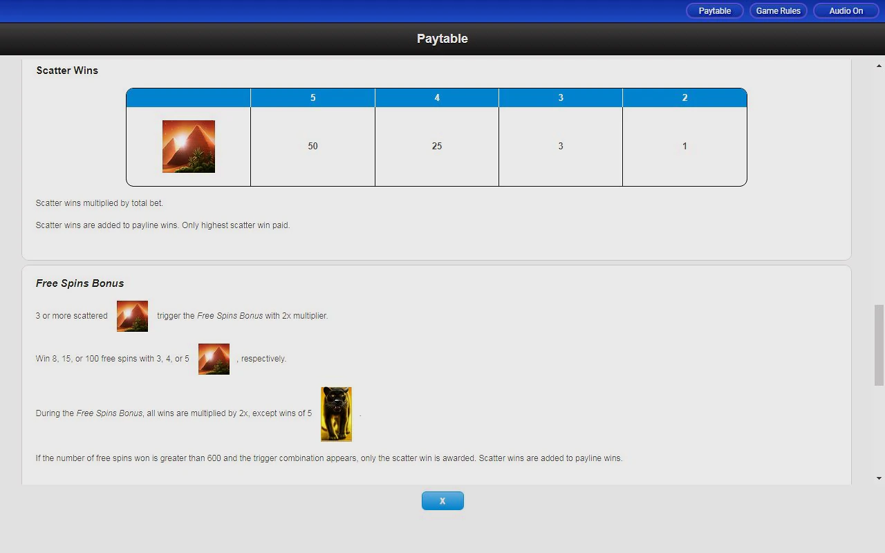 В Treasure of the Pyramids также есть увлекательный бонусный раунд, который активируется, если вы высадите не менее трех скарабеев в любом месте игрового поля. Если вам посчастливится выпасть четыре и более, ваши шансы на крупный приз увеличатся.