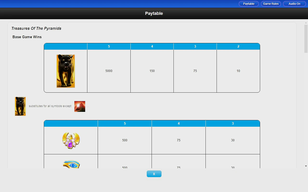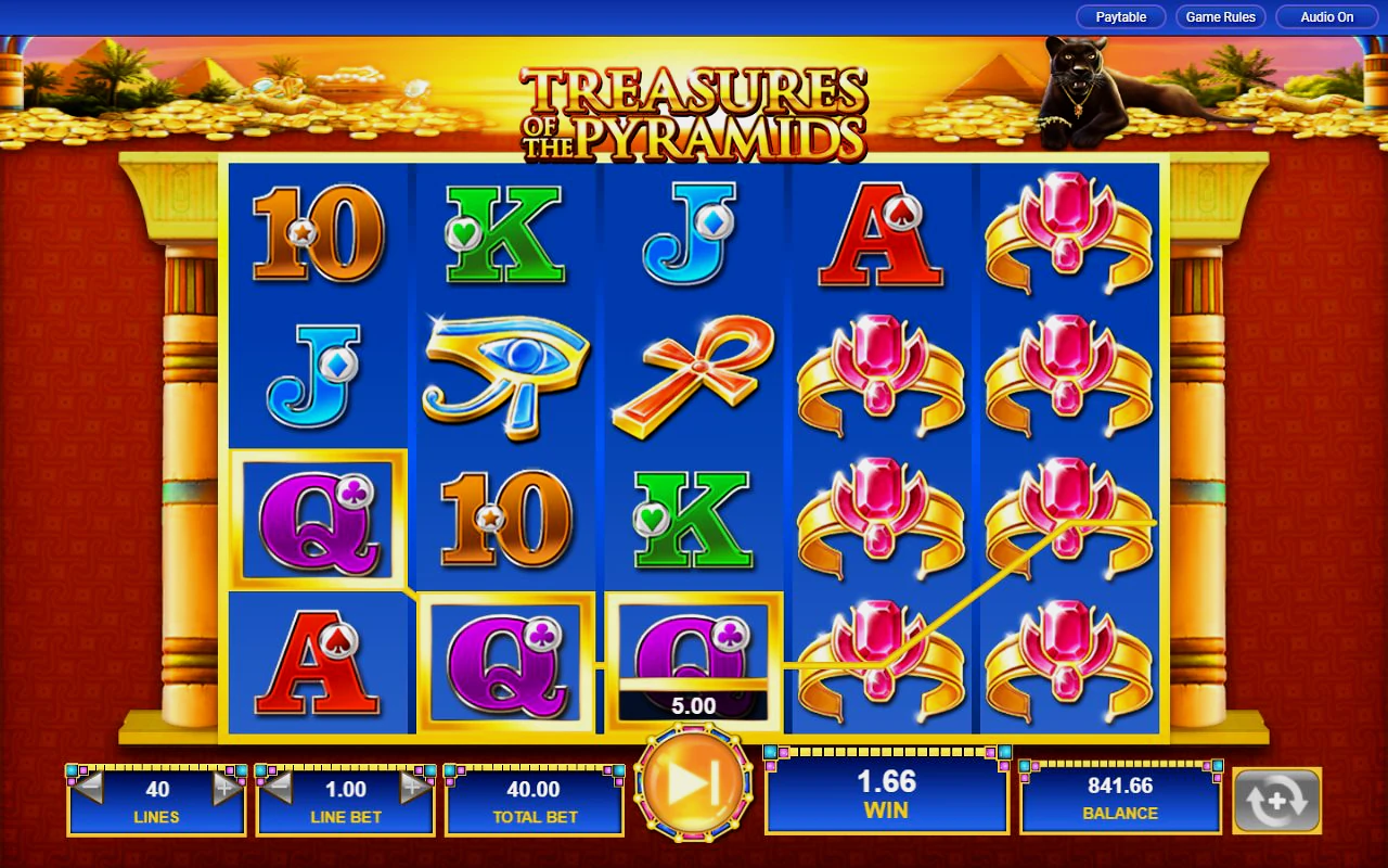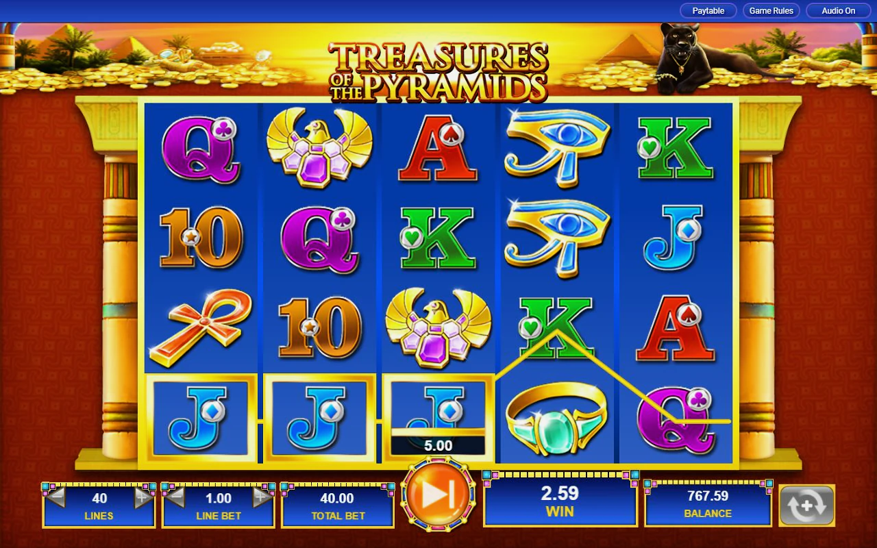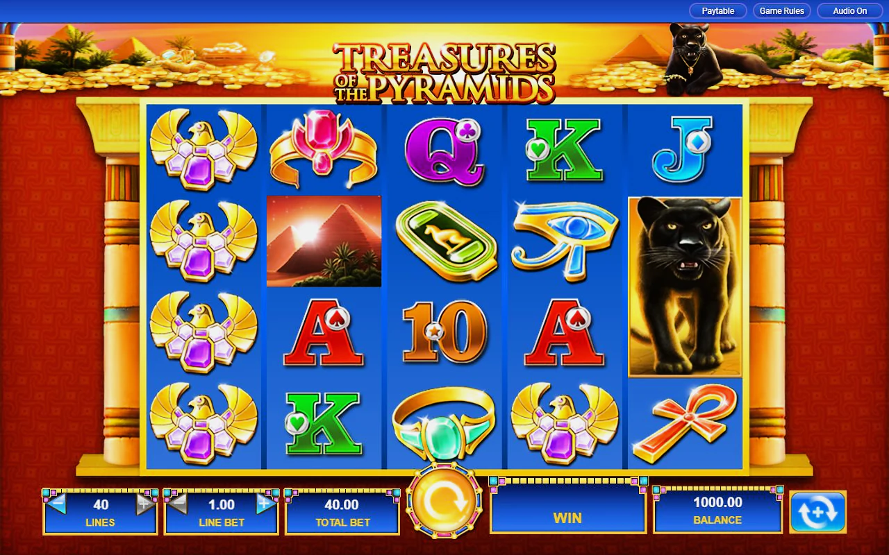 Treasure of the Pyramids — это фантастический игровой слот от экспертов IGT Gaming. Игра представляет собой стандартный пятибарабанный слот, с тремя активными символами на каждой катушке. Среди символов — фараоны, иероглифы, египетские царицы и традиционные игральные карты. Следите за специальной пирамидой — это особый символ игры, который может увеличить вашу ставку до 1 000 раз.