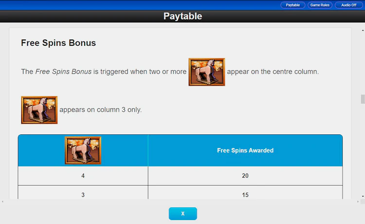 В качестве скаттера, игровой автомат Treasures of Troy предлагает легендарного троянского коня. Нужно поймать минимум 3 такие картинки для запуска бонусного раунда. От количества элементов зависит и число фриспинов. Максимально можно заработать до 20 вращений. На период бесплатных круток повышаются общие шансы на крупное умножение.