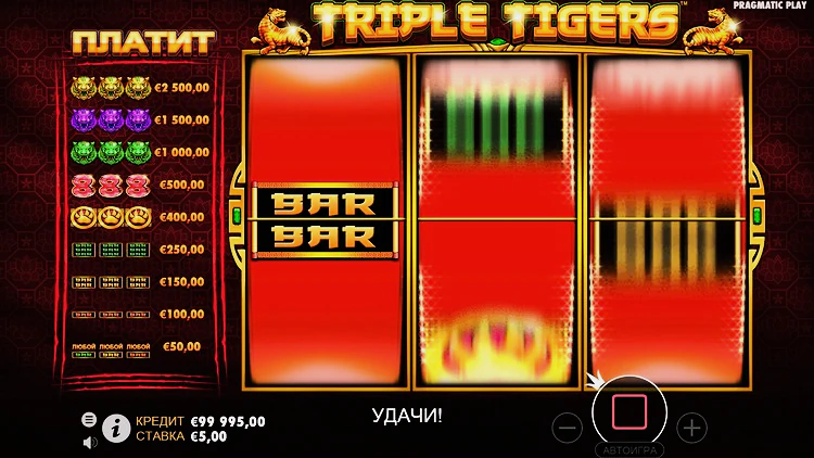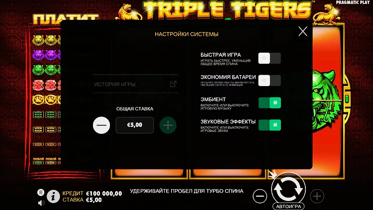 В игровом автомате Triple Tigers предусмотрена функция автоматических вращений, которая позволяет запускать автоматические вращения барабанов, нажав на кнопку Автоигра, расположенную в правом нижнем углу экрана. Эта кнопка позволяет выбрать желаемое количество автоматических спинов.