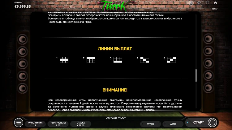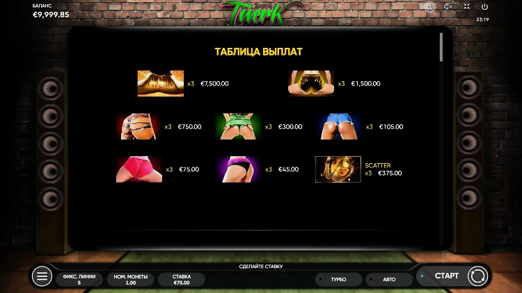 Креативность проекта не ограничивается его стилевыми решениями. Для горячего слота Twerk минимальная ставка в 0.05 USD стала идеальной опцией. Учитывая то, что в модели всего 3 барабана, линий тут не так много. Выплаты проводятся по 5 направлениям. При этом у автомата средняя волатильность, что гарантирует регулярное появление призовых комбинаций. Чтобы играть на деньги, требуется:
