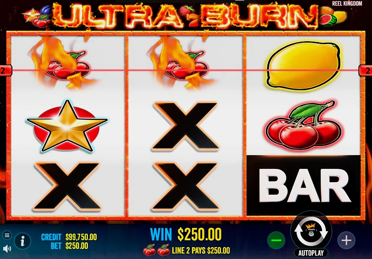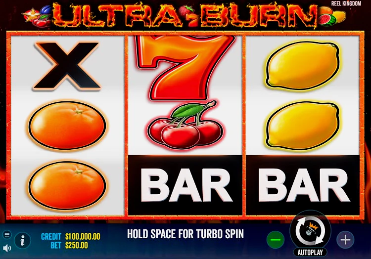 Ultra Burn — игровой автомат, созданный разработчиком Pragmatic Play. Выпущен в рамках серии Reel Kingdom. RTP достаточно высокий — 96,62%. Отличается высокой волатильностью, имеет стандартное поле — 5х3. В этом традиционном слоте нет бонусных функций, максимальный выигрыш достигается при 500-кратной ставке.