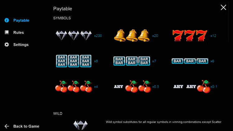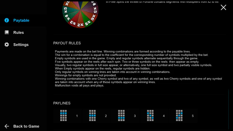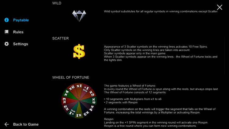 - Нажмите на значок шестеренки, чтобы получить доступ к ряду настроек. Здесь вы можете установить ставку, отрегулировать звуковые настройки, персонализировать визуальные параметры, а также просмотреть правила игры и таблицу выплат.