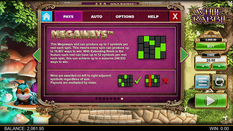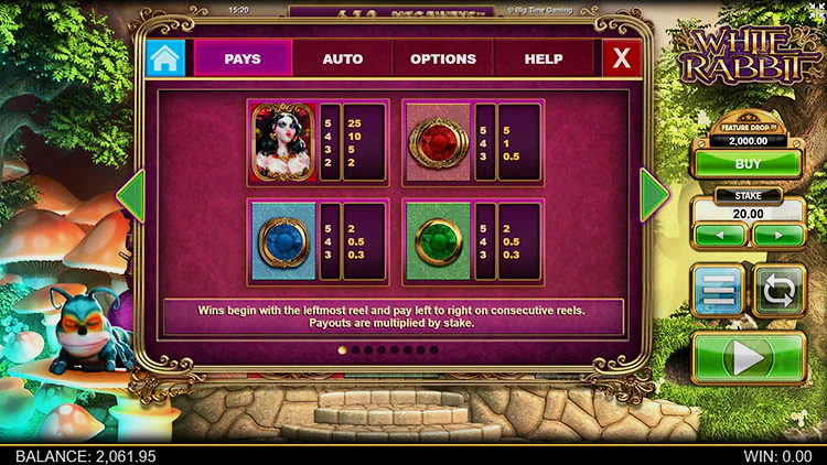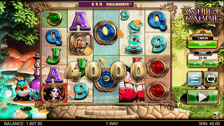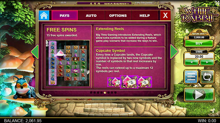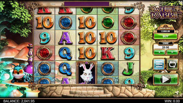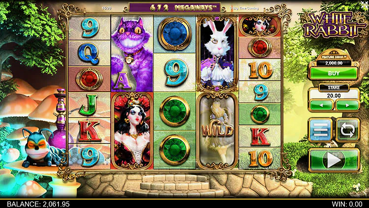 White Rabbit (Белый кролик) от девелопера Big Time Gaming предлагает гэмблерам отправиться в страну чудес Льюиса Кэррола вместе с Алисой и ее пушистым другом. На пути им встретиться много золотых монет и бонусов. У игрового автомата очень высокий процент отдачи — 97%, а при включении опции «Снижении функции» этот показатель возрастает почти до 98%. Также здесь есть спецсимволы, дающие дополнительные множители и расширяющие игровое поле, о которых мы поговорим далее.