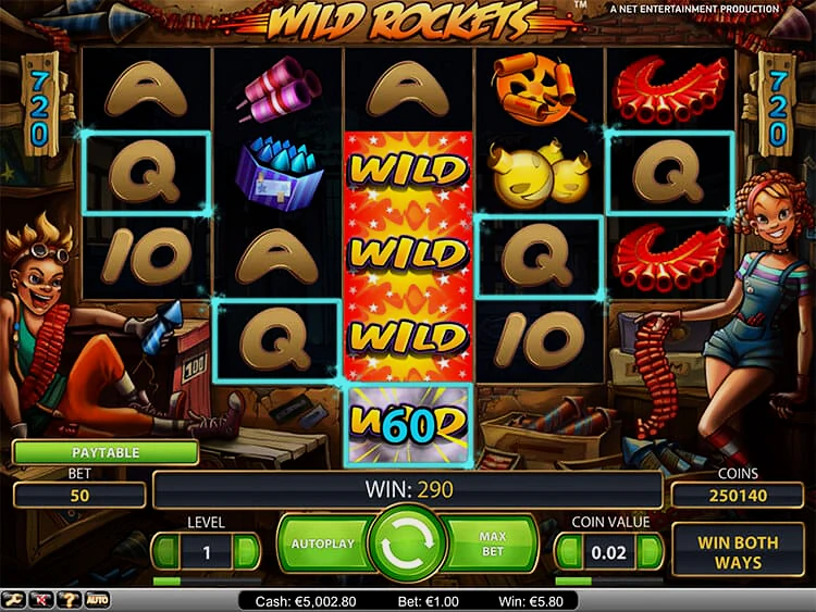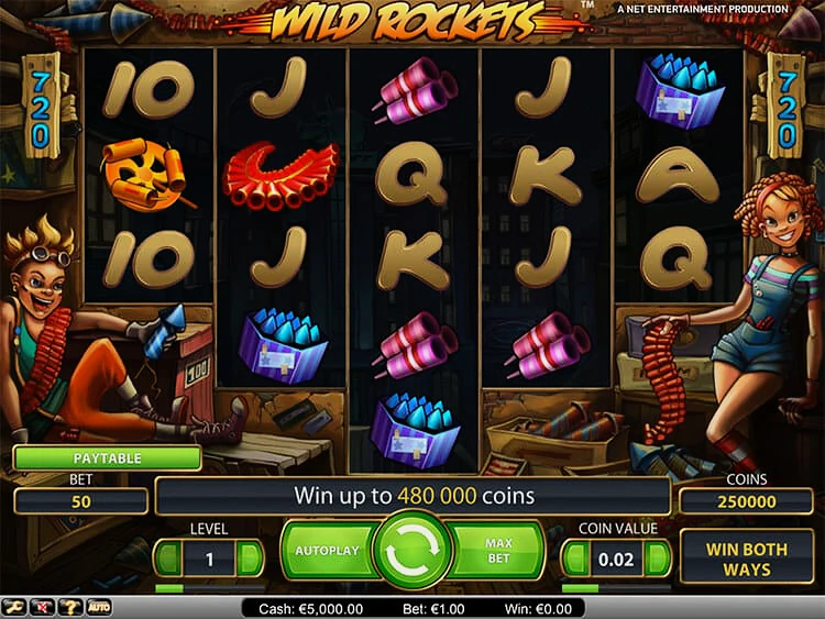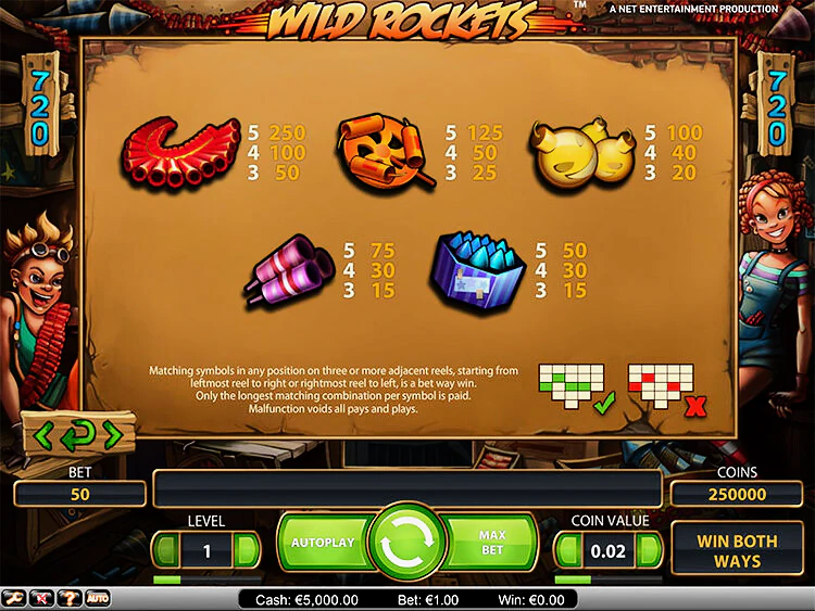 Номинал монет варьируется от 0,01 до 0,50, есть четыре уровня ставок. Минимальная ставка на спин составляет .50, а максимальная — 100.00, что делает этот слот идеальным для любого игрока с лимитами, будь вы хайроллер, который спускает сотню долларов за один спин, или игрок с бюджетом в пятьдесят центов на спин, Wild Rockets подойдет для вашего банкролла. Максимальная выплата монет за один раз составляет 480 000.