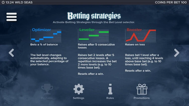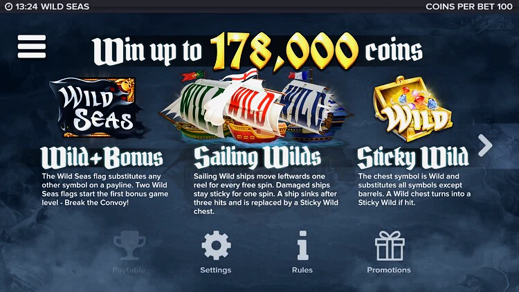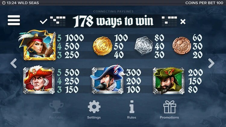 Игровое поля автомата разлиновано на 4 ряда по 5 барабанов на каждом. Путей построения оплачиваемых комбинаций — 178. При этом в Wild Seas нет привычных ставок на линии, игрок ставит сумму от 20 центов до 100 долларов на раунд. Максимально возможный выигрыш — 1000:1. О волатильности игрового автомата, к сожалению, ничего не известно. Зато RTP составляет чуть более 96%. Расчет выигрыша осуществляется исходя из коэффициента (х20-х1000). Кстати, начисленный приз сразу же выводится на основной баланс пользователя. А вот игру на удвоение разработчики не предусмотрели.
