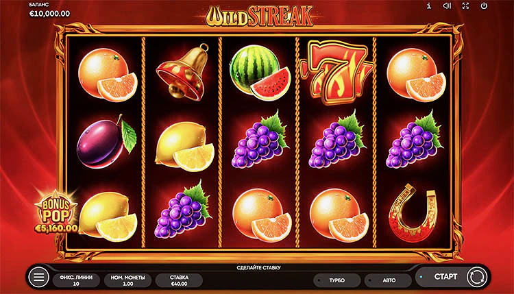 Ощутите испепеляющий жар на барабанах игрового автомата Wild Streak и насладитесь лучшей коллекцией сочных фруктов. Классическая тема в комплексе с бонусными символами и функциями позволят увеличить выигрыши, несмотря на ограниченные лимиты ставок.