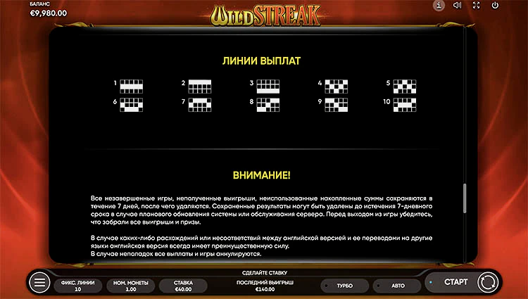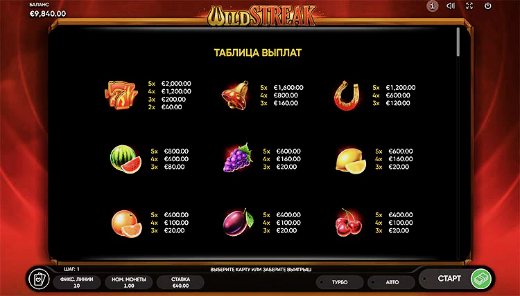 Перед тем, как играть в игровой автомат Wild Streak в деморежиме и на деньги предстоит выбрать номинал ставки. Провайдер предлагает скромный диапазон от 0,1 до 40 кредитов. Нажав кнопку вращения, следует ловить семерики, они увеличат ставку в 50 раз.
