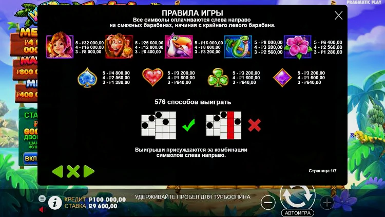 Тематические символы – это змея, птица, обезьяна и мальчик, похожий на Тарзана дают более крупные выплаты. К низкооплачиваемым символам относятся игральные карты. Выигрыши присуждаются за соседние слева направо комбинации символов, минимум трех.