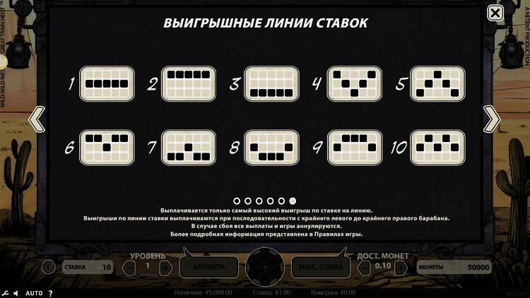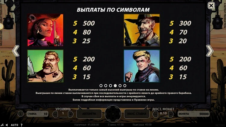 Выигрышные символы оплачиваются слева направо, и есть 10 фиксированных линий выплат. Для выигрыша необходимо собрать не менее трех символов. Есть дикий значок, который заменяет любой символ, кроме специальных. Самыми высокооплачиваемыми выигрышными символами являются банда грабителей поездов на диком диком Западе, которые увеличивают ставку с множителем выигрыша от 200 до 500 раз.
