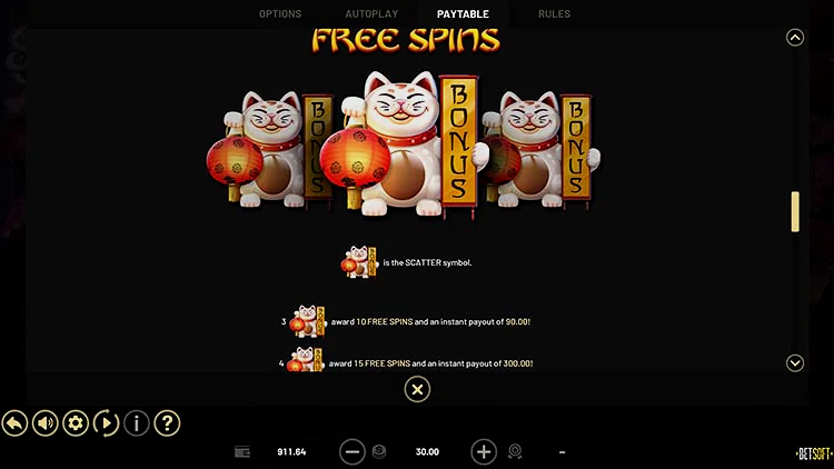 Выпадение трех, четырех или пяти символов разброса «счастливый кот» позволит вам получить мгновенный приз и сыграть в 10, 15 или 25 бесплатных вращений. Во время этой функции у вас также повышается шанс запустить Winds of Wealth. Играйте в игровой автомат Winds of Wealth в лучших онлайн-казино, чтобы получить шанс выиграть в х1506 больше вашей ставки.