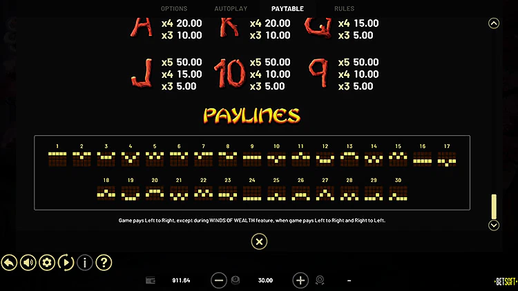 Ставьте от 0,30 до 30 монет за спин, играя в игровой автомат Winds of Wealth, и получайте выигрышные комбинации на 30 линиях выплат. Добавьте опцию buy-feature в свой план ставок и мгновенно сыграйте в бесплатные спины. Приступайте к вращению или ознакомьтесь с главными призами, которые вы можете выиграть в таблице выплат слота Winds of Wealth ниже.