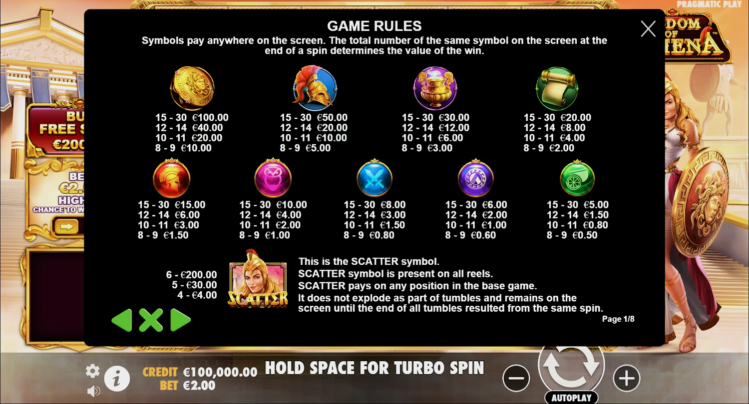 Пять низкооплачиваемых символов с различными древнегреческими изображениями оплачиваются в размере от 0,25x до 0,75x от ставки при выпадении 8-9 символов или в размере от 2,5x до 7,5x при выпадении 15+ символов. На премиальной стороне расположены 4 символа — свиток, предмет, похожий на горшок, шлем и золотое изображение. Эти символы выплачивают от 1 до 5 раз больше ставки за 8-9 OAK или от 10 до 50 раз больше ставки за 15 и более однотипных выпадений. Не ждите «дикой» помощи: в Wisdom of Athena нет диких символов.