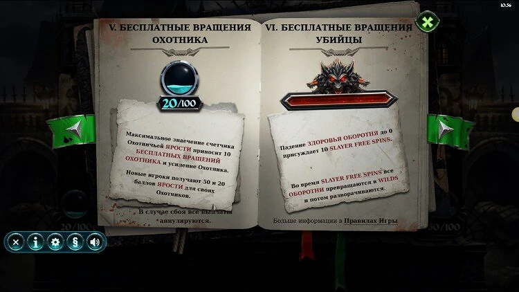 В базовой игре, если на барабанах появится оборотень, один из охотников выстрелит в него, что может запустить повторный спин. Если в Оборотня попадут, он станет липким Wild. Важно отметить, что стартовая линия жизни Оборотня равна 600 и уменьшается на 1 единицу с каждой встречей, а охотник, выстреливший в него, набирает очки ярости.
